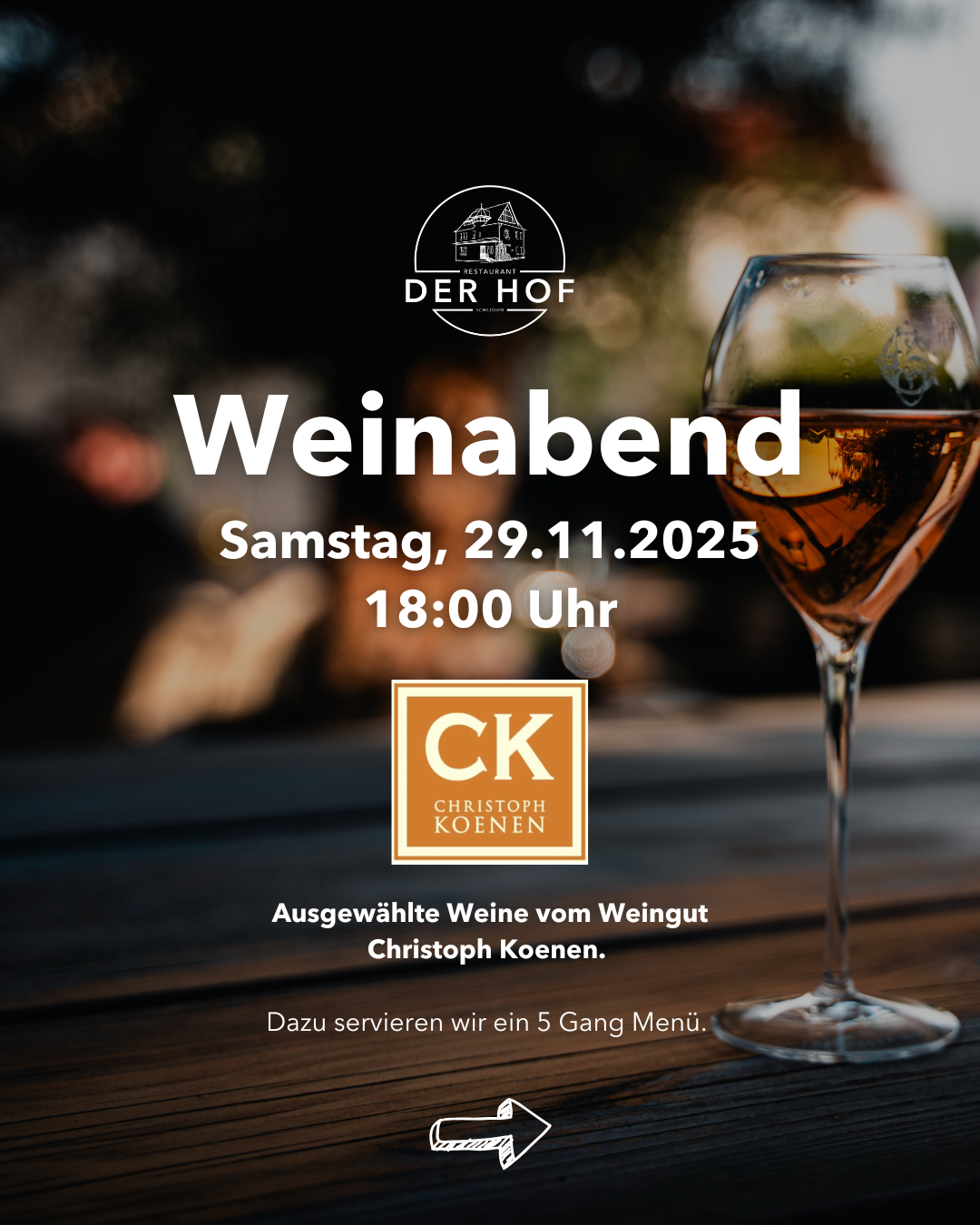 Am letzten Samstag im November laden wir Sie zu einem besonderen Abend in den Hof ein. Gemeinsam mit dem Weingut Christoph Koenen präsentieren wir Ihnen ausgewählte Weine, die wir mit einem feinen 5-Gänge-Menü begleiten.