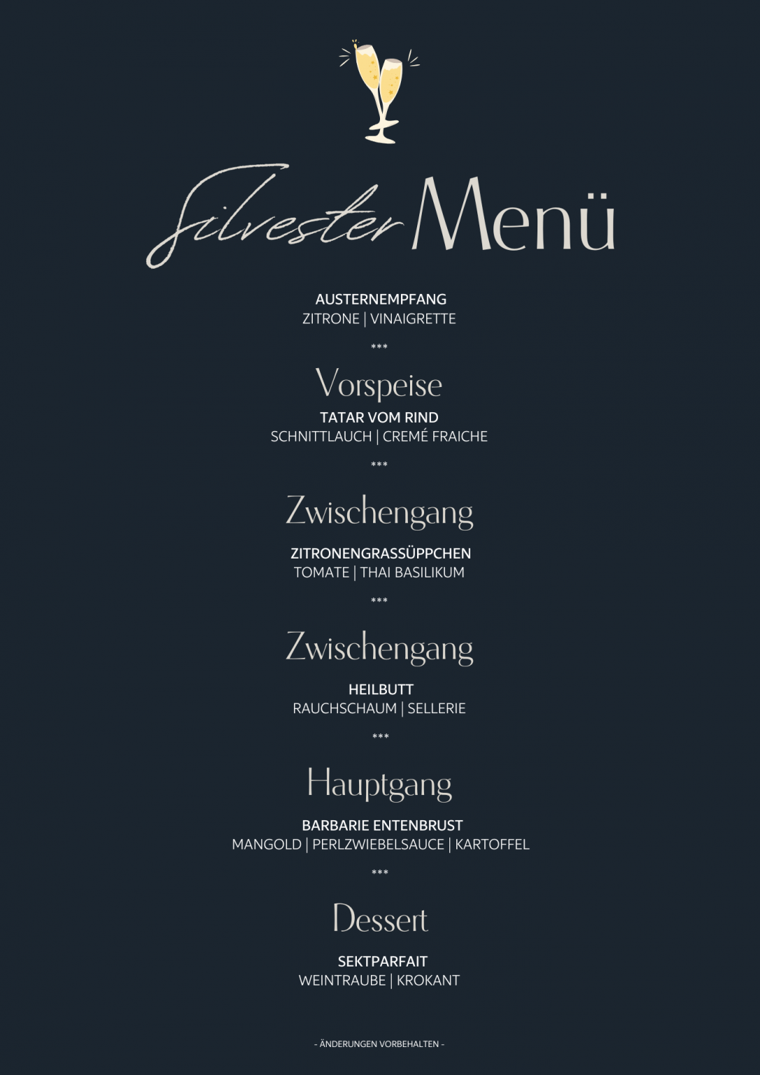 Unser Silvester-Menü inklusive Empfang erwartet Sie mit kulinarischen Highlights zum Preis von 110 € pro Person(exklusive Getränke).