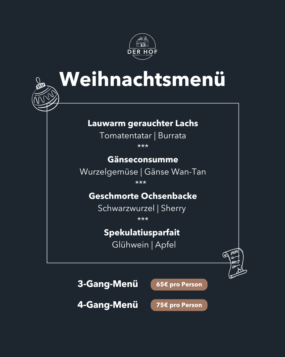 Erleben Sie einen genussvollen Jahresausklang mit feinen Speisen, stimmungsvoller Atmosphäre und unserem besonderen Hof-Flair.