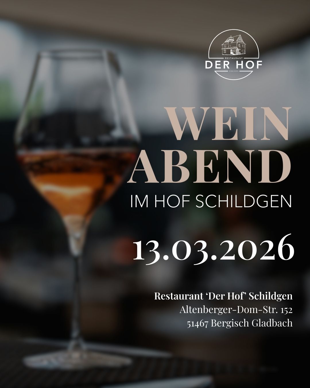 Am 13. März laden wir Sie herzlich zu unserem Weinabend im Restaurant Der Hof in Schildgen ein. Freuen Sie sich auf einen genussvollen Abend in entspannter Atmosphäre.